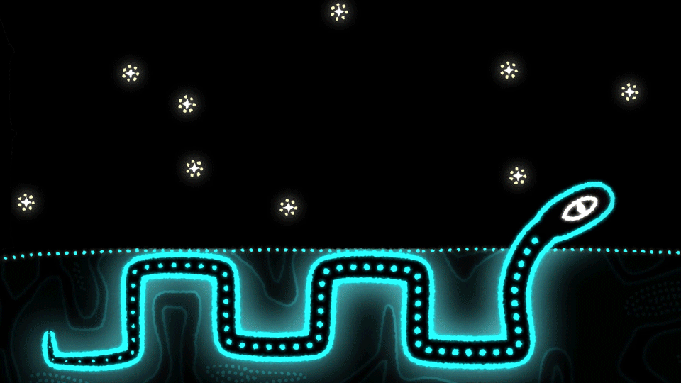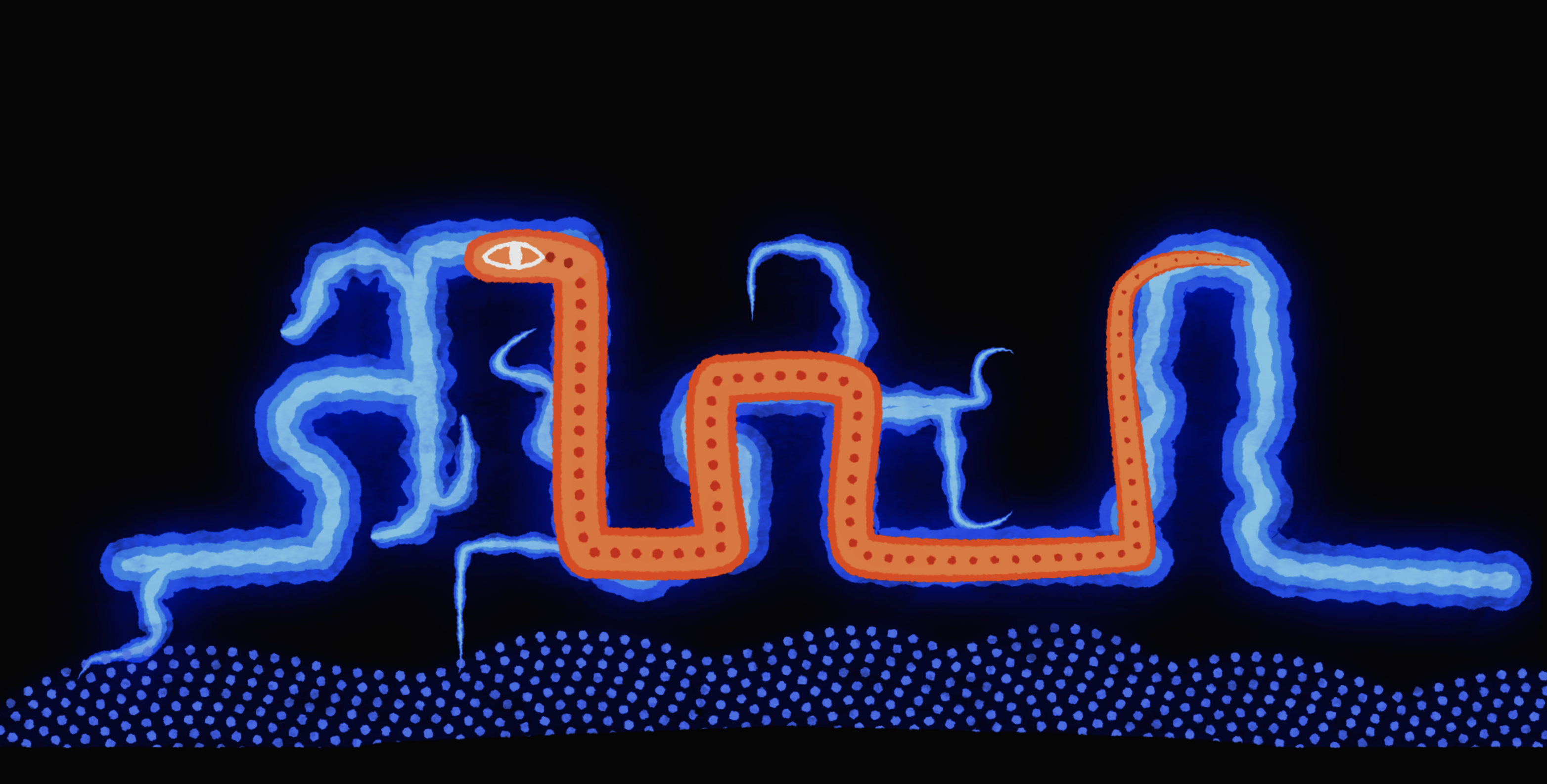 Under their trajectory, the earth is shaped. Among these ancestors is Waagal the rainbow serpent. His movements enable the creation of rivers, bringing water and life around him. Tired of their intense activity, the ancestors return to the ground, to sleep in the heart of the earth.